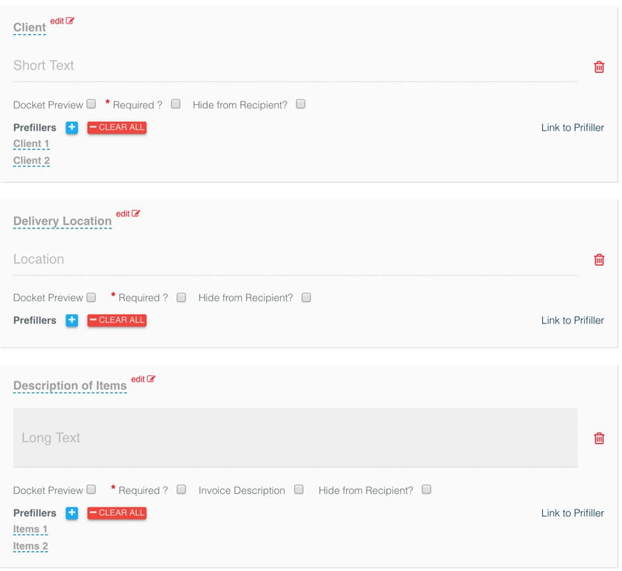 Add another short text field called “Client” and a location field called “Delivery Location”. You can use pre fillers here as well to load some common clients and locations. Finally, go ahead and add a long text field called “Description of Items”: